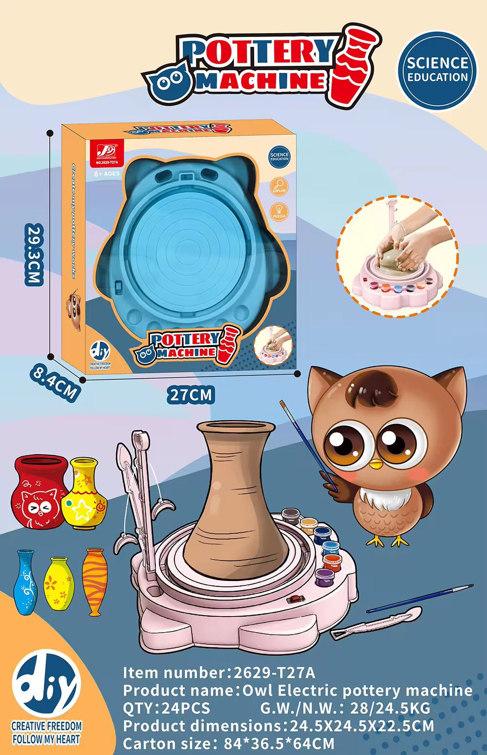 - تتضمن عجلة فخار، ألوان، أدوات تشكيل، 3 عبوات طين، قوالب، وبذور للزراعة.